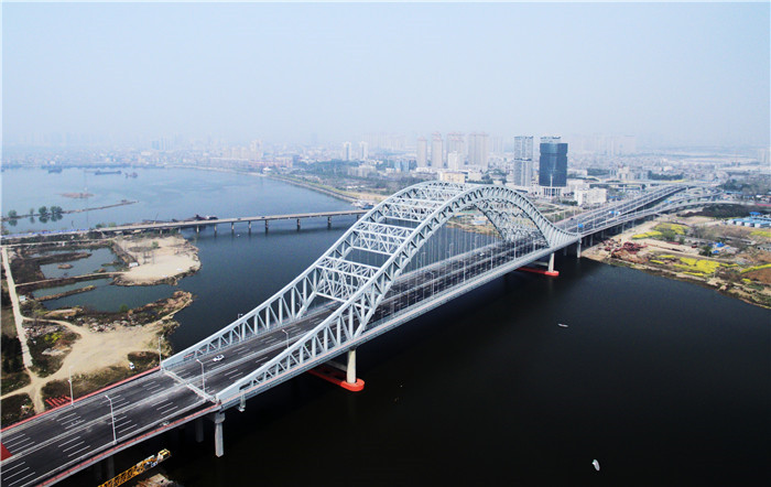 新六兩河大橋位于老六兩河大橋上游300米,大橋全長1945米,橋面寬約45米,雙向八車道,主跨達到240米。為了不影響唐白河的通航能力,大橋采用下承式連續剛桁架拱橋,從遠處看,大橋形似一道橫跨唐白河的美麗彩虹,顏值爆表,這種類型的橋梁不僅在襄陽是第一座,也是鄂西北首座,被襄陽市民們譽為一張新的城市名片。