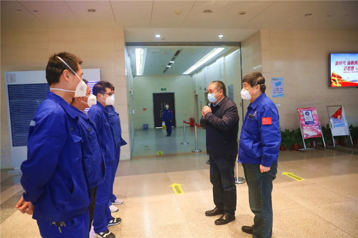 ▲張文彤在陳?降吶閫?下看望慰問公司援建火神山、雷神山醫院的職工代表