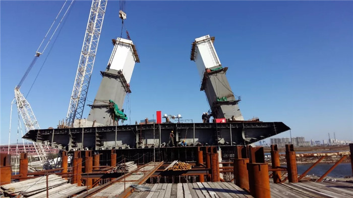 由于沿海地區風力較大,考慮其特殊的結構造型和現場施工條件的限制,武船重工股份經過反復論證后,采取了“超大型構件液壓同步提升施工技術”進行豎向轉體的方式安裝,變風險較大的高空作業為地面施工,并就提升方案進行了多次探討和實地演練,確保方案在實施過程中萬無一失,南、北側軸線偏差控制在5mm以內,各項指標均達到設計要求,施工及合龍過程異常順利。該施工工藝在國內北方沿海地區首次成功使用,大幅縮短了工期,降低了施工成本和安全風險,安裝質量和整橋受力狀態都有顯著提高。