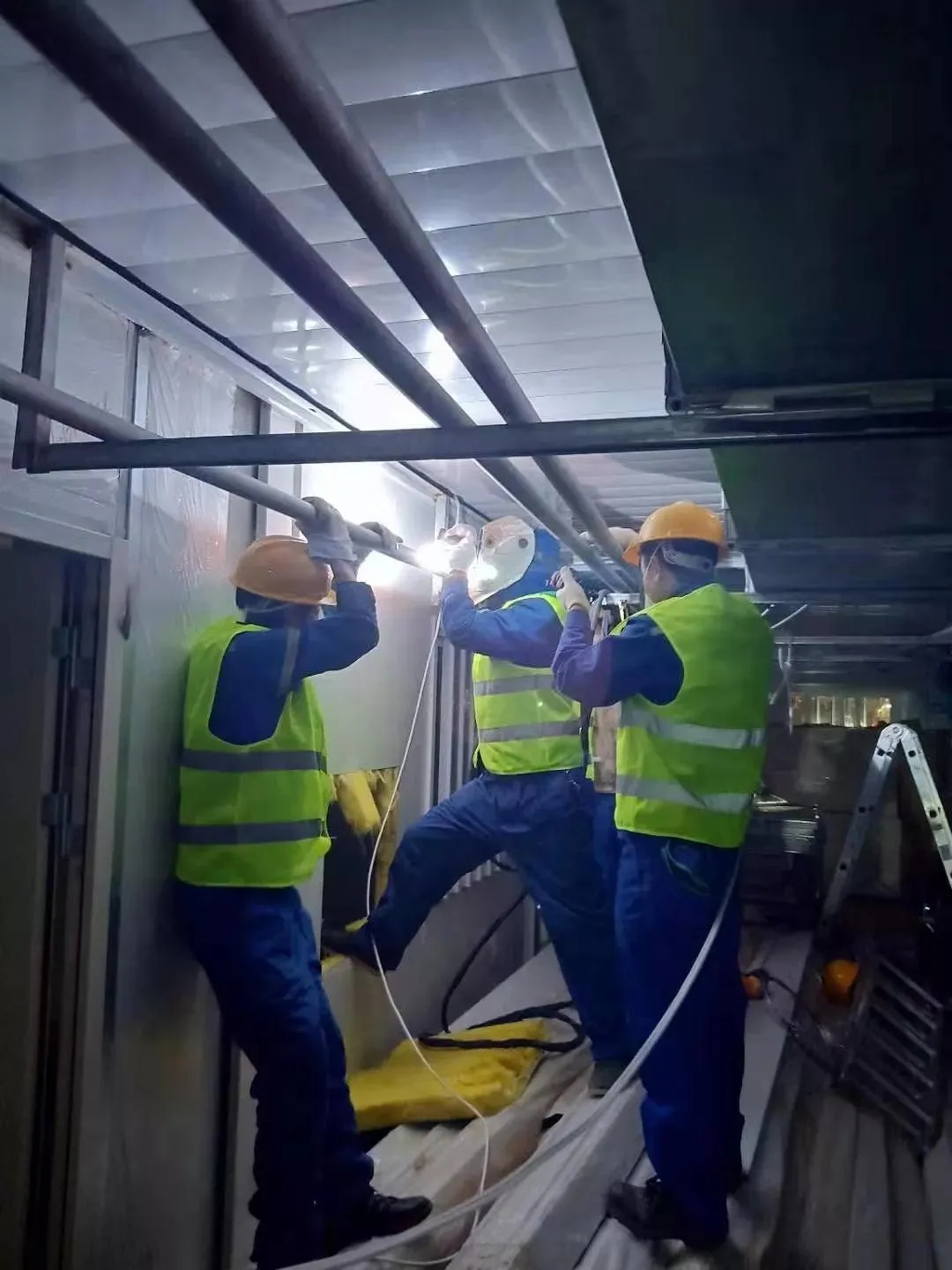 緊接著,操起電焊工的老本行。一時(shí)間,氬弧焊耀眼的白光將施工區(qū)域的長(zhǎng)廊照的通透!