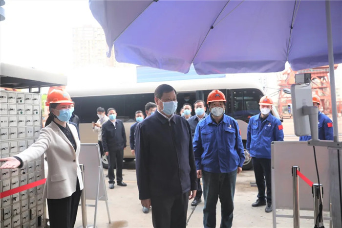 應(yīng)勇一下車便來到武船生產(chǎn)車間,登上作業(yè)平臺,深入一線實地考察企業(yè)復(fù)工復(fù)產(chǎn)情況。陳?較蛩?詳細(xì)介紹了公司產(chǎn)業(yè)布局、生產(chǎn)能力、重點產(chǎn)品,歷史沿革以及當(dāng)前在制重點產(chǎn)品生產(chǎn)建造情況和武船參加武漢市社區(qū)疫情防控工作情況。在目前國內(nèi)外防疫形勢依然嚴(yán)峻的情況下,公司為了有序推進(jìn)武漢、青島兩大基地復(fù)工復(fù)產(chǎn),積極籌措防疫物資,建立防控工作機制,設(shè)立隔離觀察區(qū)域,消殺工作生活場所,集中管理返崗人員,開展安全生產(chǎn)檢查,并于近日得到主管部門批復(fù)后順利復(fù)工。